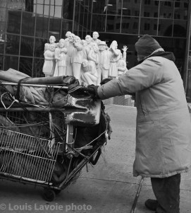 Je n’ai même pas eu le temps de réfléchir. L’itinérant venait dans ma direction, poussant lourdement son chariot remplis d’objets et de vêtements. Il marchait d’un pas déterminé et rapide, ignorant ma présence.