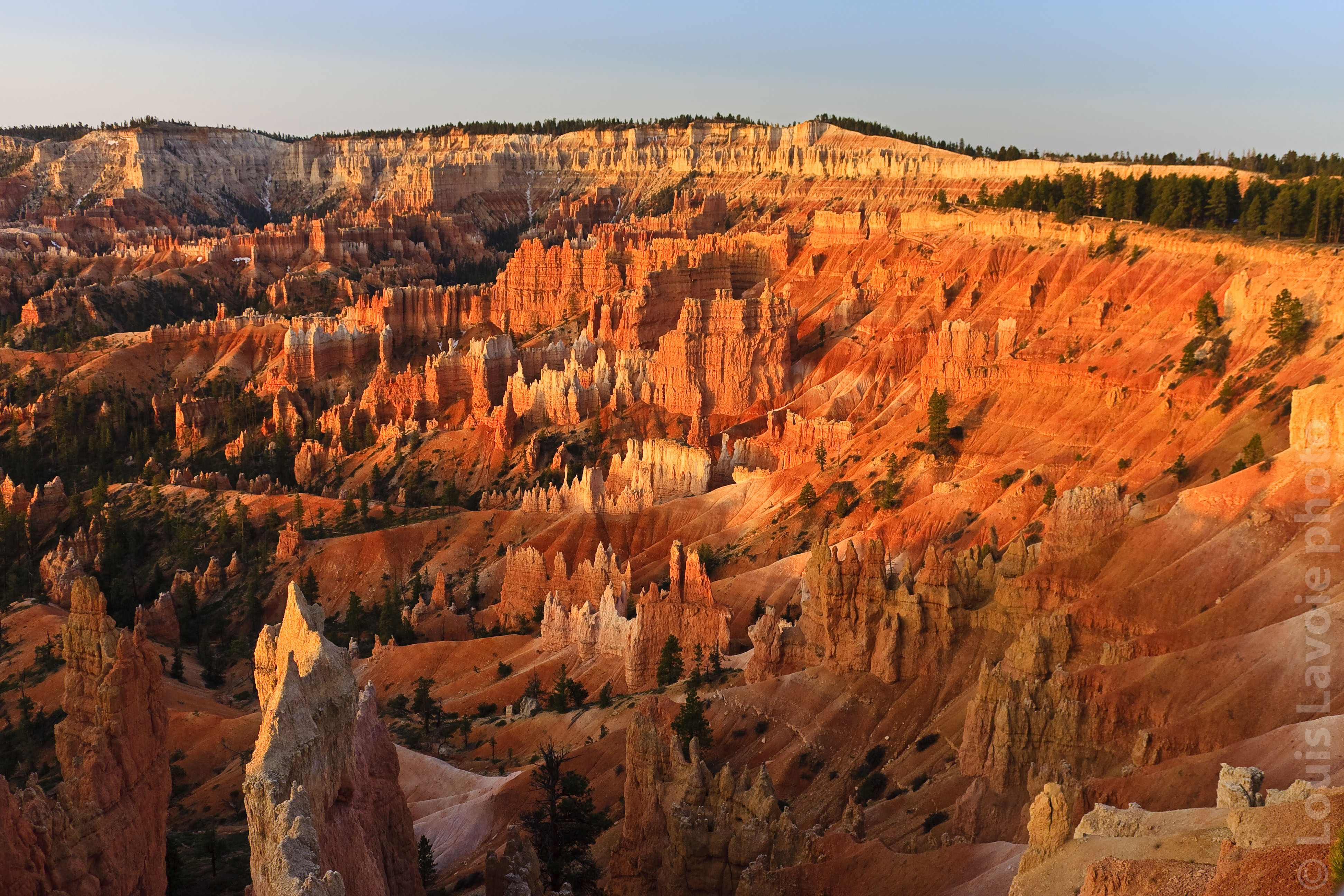 Phénomène rigolo, de la trentaine de photographes que nous étions, seul un autre photographe et moi sommes restés sur les lieux après le lever du soleil.  Et pourtant, l’heure dorée ne venait que de commencer.  Nous avions encore un beau 45 minutes de belle lumière pour faire de la photo, d’où les photos avec plus de détails, dont celle au haut de l’article et cette autre au bas.  Vrai qu’il faut être habillé au chaud à Bryce Canyon, compte tenu de son élévation (2 400 à 2 700 mètres).