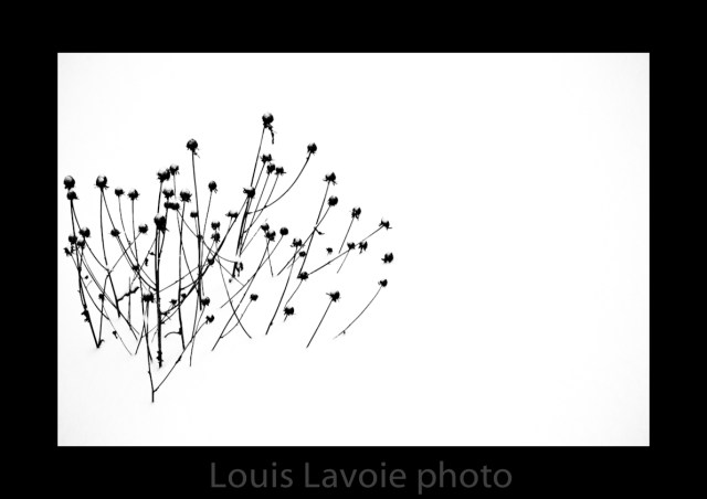 Le vide. Parfois, selon le temps de la saison, l’humeur au boulot, la vie chamboulée, ça sonne comme un oasis. C’est le cas présentement. C’est le cas dans cette photo. Il ne faut pas craindre le vide à l’occasion dans nos photos. Pas besoin d’avoir une densité visuelle complète pour réussir une photo. Pas besoin de rechercher la courbe pleine dans notre histogramme. Certains sujets s’y prêtent. Dans ce cas-ci, je voulais faire un sujet de ton noir sur un fond blanc pur. Volontairement j’ai bracketé pour obtenir un blanc sursaturé. Pertes d’informations certaines. Blancs brûlés? Assurément. Volontairement. Sujet à l’encre de Chine sur toile blanche. Cliquez sur la photo pour la voir en plus grand format.