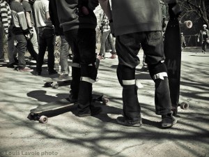 Toutefois, les premières photos que j’ai faites (pour la forme) comme celle-ci ne s’inscrivent pas la foulée de la simplicité volontaire que je vous recommandais il y a quelques semaines.  Pas besoin d’être observateur pour voir combien le sujet est confus.  En fait, quel est le sujet?  Plusieurs paires de jambes qui se superposent les unes avec les autres, quelques skateboards, des attroupements, rien de très signifiant.  Il fallait que j’identifie un sujet plus fort et surtout, que je trouve l’histoire à raconter.