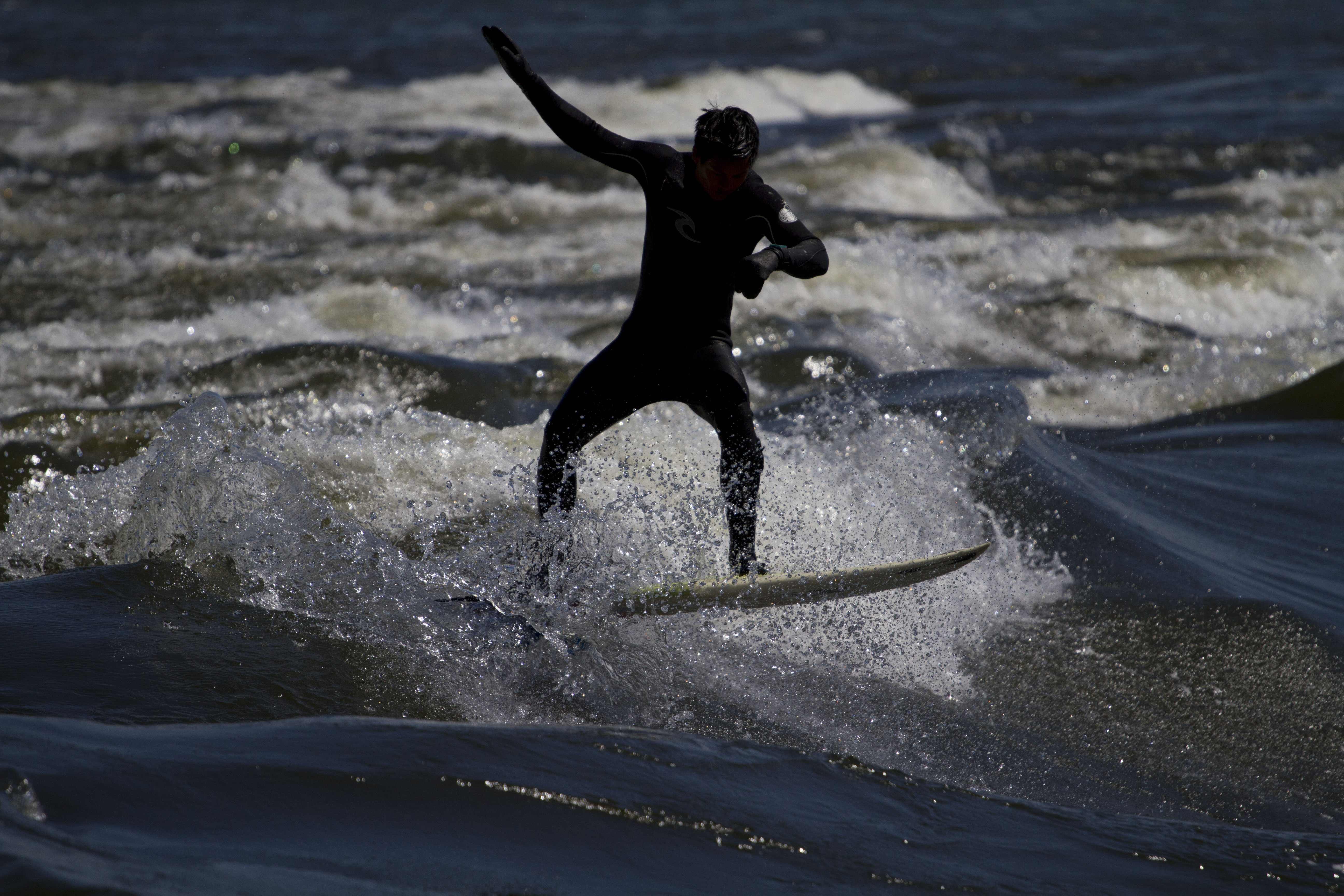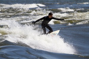 Voilà qui habituellement fonctionne bien à 80% du temps. Toutefois, dans la photo ci-contre, voici un très bon exemple d’une situation où la mesure évaluative ne convient pas du tout. Cette photo sort directement de mon boîtier – sans retouche aucune. Un surfeur pratique son sport dans les vagues provoquées par des remous au bord du St-Laurent à Montréal. Le défi pour l’appareil est immense: beaucoup de blanc dans les remous alors que le surfeur est très sombre en raison de son «wet suit». L’appareil photo fait une mesure d’exposition dans l’ensemble du cadrage. Puisque de puissants remous blancs sont présents et que la lumière est très vive, l’appareil photo considère qu’il ne doit pas exposer longtemps cette photo pour la réussir. Pour vous aidez à visualiser cette situation, l’appareil a le même réflexe que s’il photographiait un champ de neige. À 200iso et pour une ouverture F4, il a déterminé qu’une vitesse de 1/8000 de secondes était suffisante. Vous le constatez, il en résulte en une énorme sous-exposition. Pourquoi? Puisqu’il y a beaucoup de blanc lumineux dans la photo, l’appareil procède à une moyenne en fonction de ces masses blanches. Les bouillons blancs sont ramenés au classique gris 18% que recherche l’appareil photo (vous vous souvenez de l’article sur la neige grise?). Il aurait fallu que je fasse du bracketing pour compenser. Pour notre appareil, il considère qu’il vient de réussir sa mission. Misère! Le surfeur est méconnaissable, beaucoup trop sombre, à la fois son vêtement et son visage. Et j’ai beau évoquer des bouillons blancs lumineux dans ma photo, vous les cherchez sûrement.