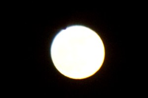 La semaine dernière, nous avions justement un autre beau sujet pour lequel la mesure spot était tout indiqué. La lune! Cette superbe lune pleine au rendez-vous samedi soir (quelques nuages en sus!). Voici tout d’abord cette lune prise avec une mesure évaluative. Vous constatez que l’appareil a fait ses calculs en fonction de l’ensemble du cadrage. Ayant constaté une bonne quantité de noir dans le cadrage, l’appareil a donc choisi des paramètres qui tiennent compte passablement de cette masse noire. L’appareil a voulu faire entrer de la lumière suffisamment longtemps pour tenter d’éclaircir cette masse noire. Iso 400, F3,5, 1/125 de seconde. Résultat? Une lune pleine toute blanche, sans aucun détail puisque l’exposition était trop longue pour aller chercher des détails dans la lune.