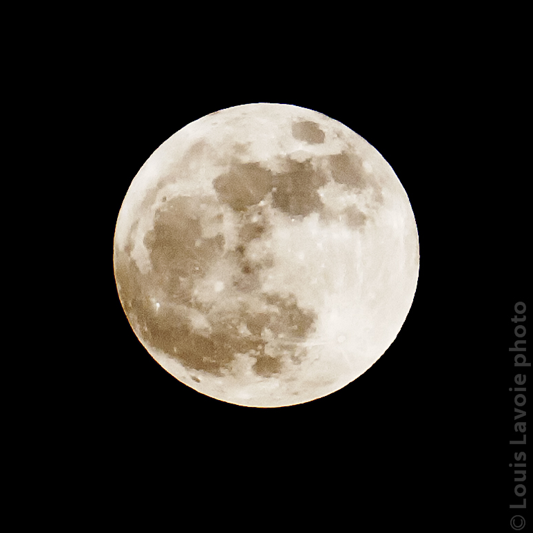La même lune évidemment mais en ayant recours à la mesure spot. Différent n’est-ce pas? La mesure d’évaluation ne tenait pas compte du noir ambiant mais faisait une lecture directement sur le centre de la lune. Le noir n’importait plus. Qu’importe: du noir, c’est du noir. Résultat: une vitesse plus rapide qui nous permet d’avoir plus de détails. Iso 400, F5,6, 1/500 de seconde. Voilà une lune beaucoup plus intéressante. Lorsque la lune est magnifique, pourquoi ne pas sortir votre plus longue lentille, faire une mesure spot sur cette lune en utilisant votre trépied? Vous avez une tablette numérique ou encore un téléphone intelligent? Procurez-vous une des meilleures ressources pour les éphémérides et ainsi prévoir le passage de la lune et ses heures de lever et de coucher.