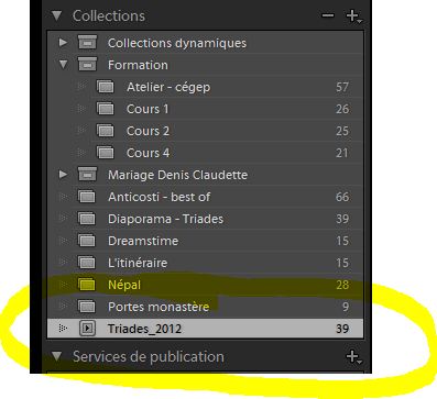 Avec Lightroom, facile de procéder par étape.  Initialement, j’ai profité du module «Bibliothèque» pour constituer une nouvelle collection à l’intérieur de laquelle j’ai regroupé les photos qui m’apparaissaient les plus pertinentes pour mon diaporama.  Initialement, l’ordre des photos importait peu.  J’ai beaucoup apprécié le fait que je n’avais pas à produire mes fichiers dans un format spécifique – JPEG par exemple – pour que le diaporama puisse les prendre en charge.  Même mes fichiers RAW traités mais non exportés en JPEG pouvaient être intégrés dans ma collection et pourront être pris en charge par le module diaporama.  Du boulot en moins.  Bravo!