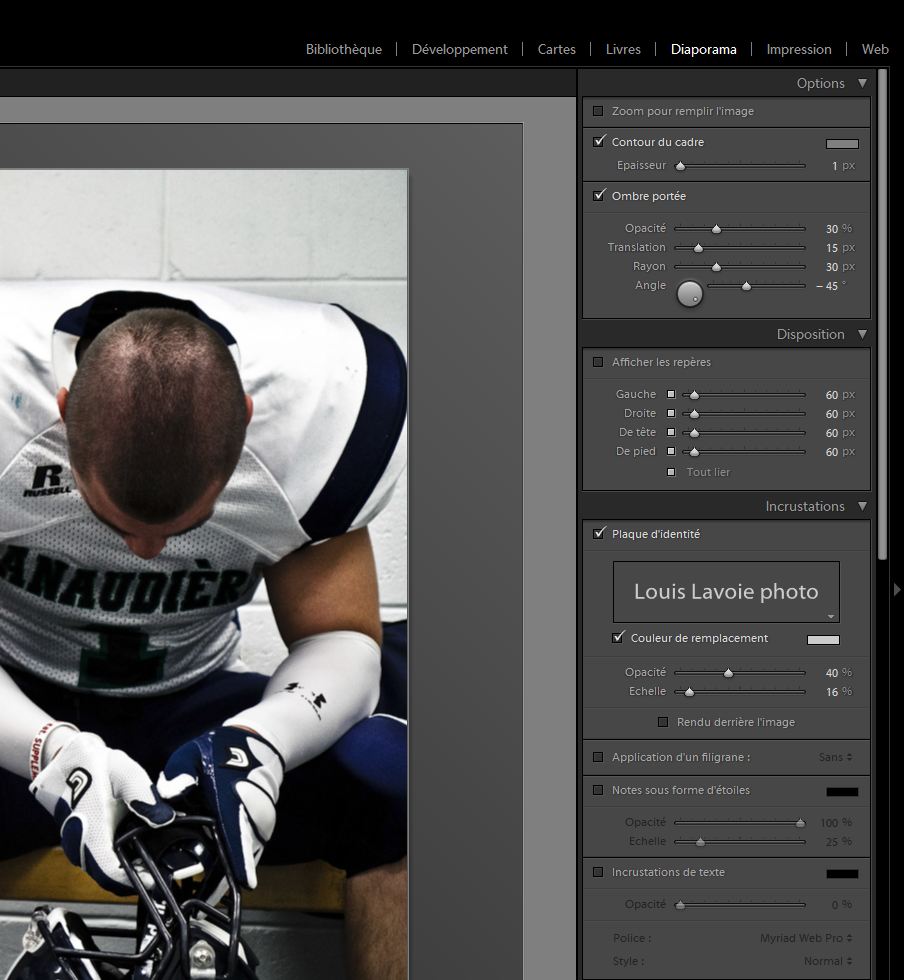 menu_droit_1J’ai trouvé le module «Diaporama» de Lightroom très intuitif et facile.  Voilà qui faisait changement d’autres logiciel que j’avais manipulés par le passé.  On veut inclure une diapo d’ouverture ou de fin?  On inscrit tout simplement notre texte ou encore on utilise notre plaque d’identité graphique de Lightroom.  Si vous avez soigné et peaufiné celle-ci, vous allez apprécier de pouvoir récupérer et utiliser le fruit de votre travail.  On peut également fignoler les bordures, l’ombre portée, l’arrière-plan, la trame.  On peut insérer un titre en filigrane pour toute la durée du diaporama.  L’arrière-plan de notre diaporama peut être une couleur de fond ou encore une image.