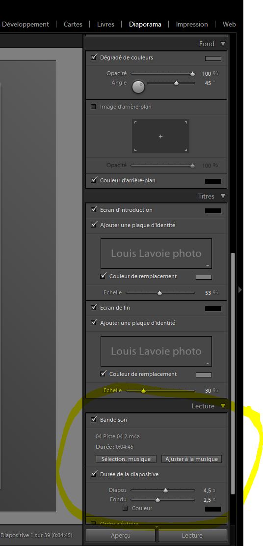 menu_droit_2Là où Lightroom m’a beaucoup charmé est au chapitre de l’ajout de musique et du synchronisme entre celle-ci et nos photos. Dans certains logiciels, je me souviens que je devais additionner ou soustraire des photos pour espérer arriver pile entre la présentation des photos et la fin de la trame musicale.  C’était laborieux et me faisait davantage penser à un travail d’orfèvre.  Avec Lightroom, le tout se synchronise parfaitement.  Dans le cas de mon diaporama, j’ai choisi une pièce musicale que j’ai ajouté au diaporama dans le module.  Lightroom a calculé lui-même la durée nécessaire pour chaque photo afin d’arriver pile avec la fin de la trame musicale.  Je retirais une photo ou j’en ajoutais une?  Lightroom faisait de nouveaux calculs.  Petit tuyau: le tout ne m’apparaissait pas synchronisé parfaitement lorsque je visionnais le boulot dans mon écran de travail avec le bouton «Aperçu». Par contre, le résultat devenait impeccable lorsque je revoyais le tout dans l’écran «Lecture».  À la sauvegarde du diaporama en mode vidéo, j’ai été rassuré sur l’exactitude de la synchronisation.  Bravo Lightroom.