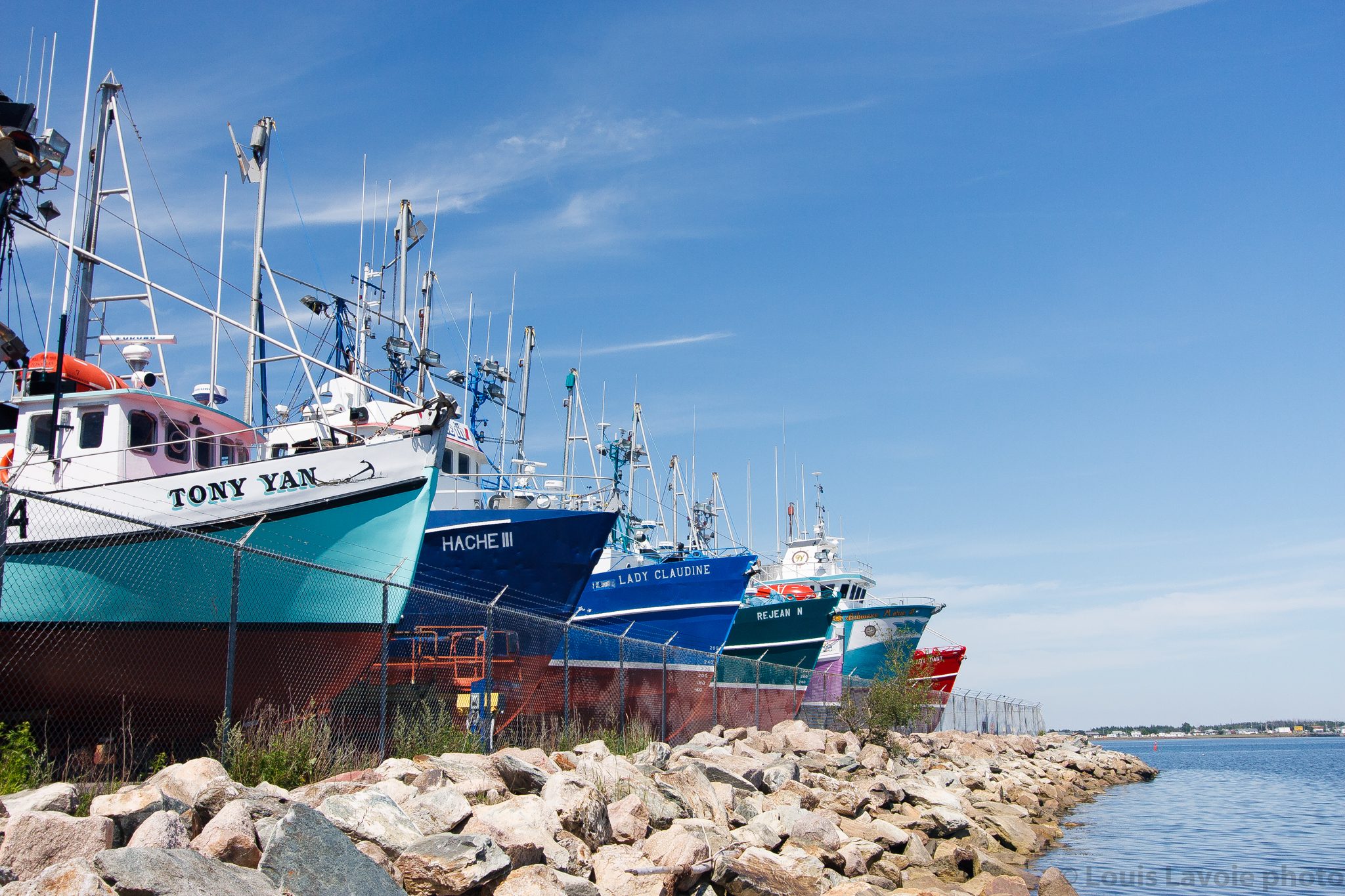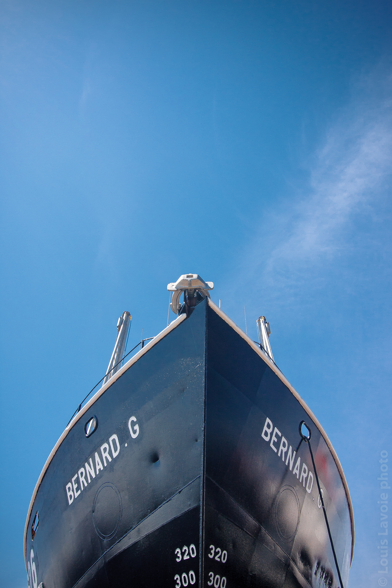 La tentative avec la photo 4/9 est plus réussie. En choisissant une perspective en contre-plongée et surtout en ramenant mon sujet à qu’un seul bateau de pêche, j’ai réussi à éliminer l’incommodante clôture dans ma composition. La coque et la proue du bateau sont intéressantes. En prime, j’aime bien comment un fin nuage vient briser l’harmonie d’un ciel trop bleu. Le sujet est bien présent grâce à la technique du cadrage rentre-d’dans. Toutefois, la photo 5/9 n’est pas aussi réussi que la 4/9. Primo, je n’ai pas porté suffisamment attention à mon cadrage et le haut de la clôture s’est à nouveau intégrée dans celui-ci. L’absence de nuages fait en sorte que le 2/3 de ma photo manque d’action, de stimulus pour l’oeil. Photo sans personnalité. La photo 6/9 illustre que Paule a joué pleinement le rôle de la photographe sans peurs (et sans reproches) en se glissant sous la grille, malgré les «accès interdits» bien évidents 🙂 De mémoire, outre une bonne dose d’audace, elle privilégiait également une lentille grand angle, la Tokina 12-24mm 😉