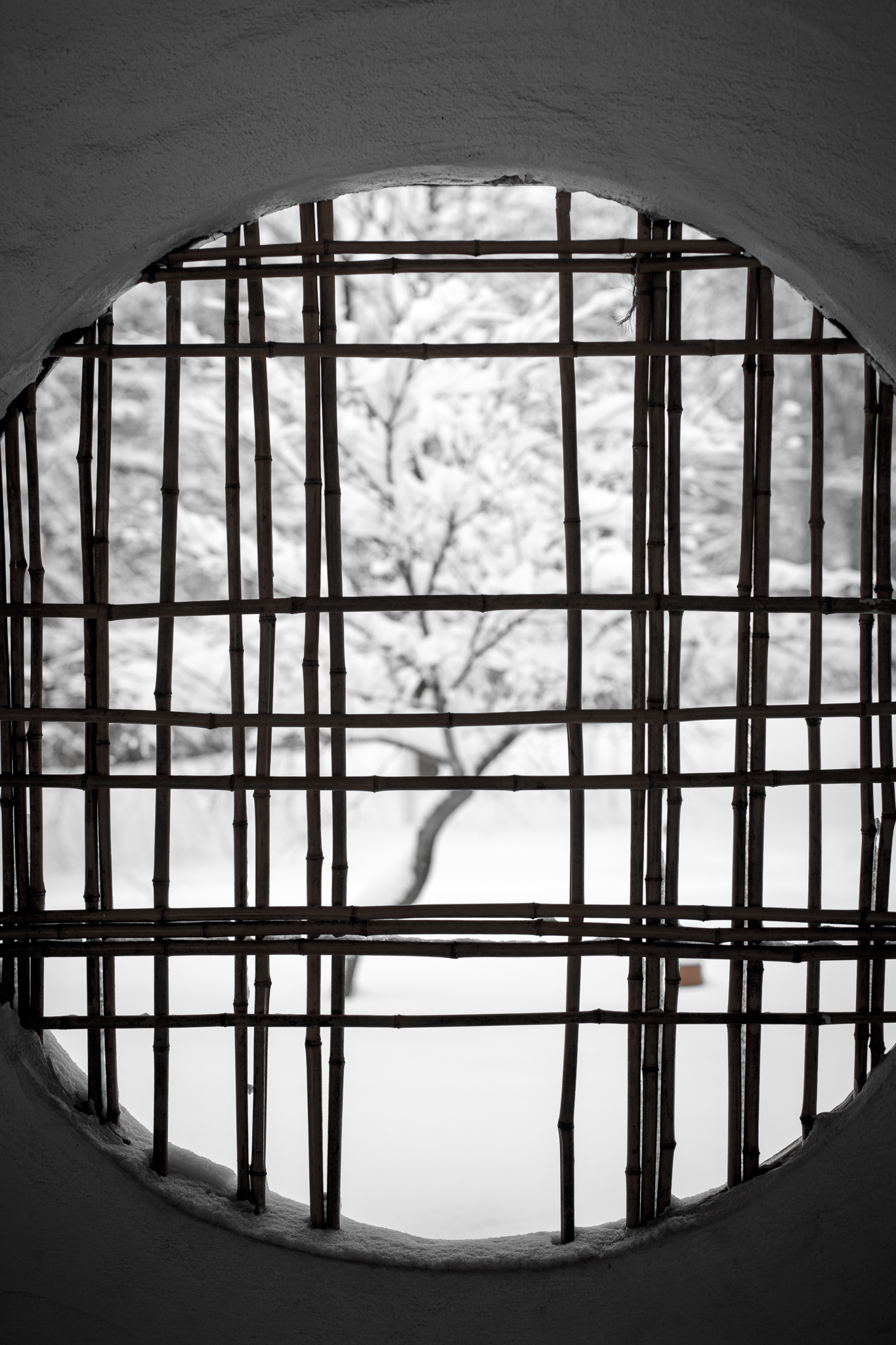 Mon premier exemple est animé par un de mes sujets de prédilection au Jardin botanique de Montréal, soit ce grillage de bambou dans un pavillon du Jardin japonais. J’adore les quiétudes des lieux. En marge des heures de grande affluence, le temps s’arrête. La ville est au loin. Chaque petit recoin du Jardin japonais est un oasis de quiétude intérieure. Étant présent dans le Jardin japonais pendant une tempête de neige, vous devinez que j’avais les lieux à moi seul. J’ai été attiré par mon grillage de bambou et l’arbre au-delà de cette ouverture. J’ai cadré et fait la mise au point au premier plan. Clic! 1/640 de seconde, F4, ISO 100, lentille 50mm fixe. Photo réussie. Toutefois, l’élément brun à l’arrière-plan (2/3 en bas à la droite) est désagréable. C’est le point brun qui dépasse d’une des tiges de bambou. Je l’ai remarqué à la prise de vue. Bien entendu, je pouvais me dire qu’avec mon logiciel, je pourrais tenter de faire disparaître. Mais pourquoi ne pas le faire dès la prise de vue? N’hésitez pas à cliquer sur la photo si vous voulez la visionner en plus grand format et voir l’objet qui me dérangeait.