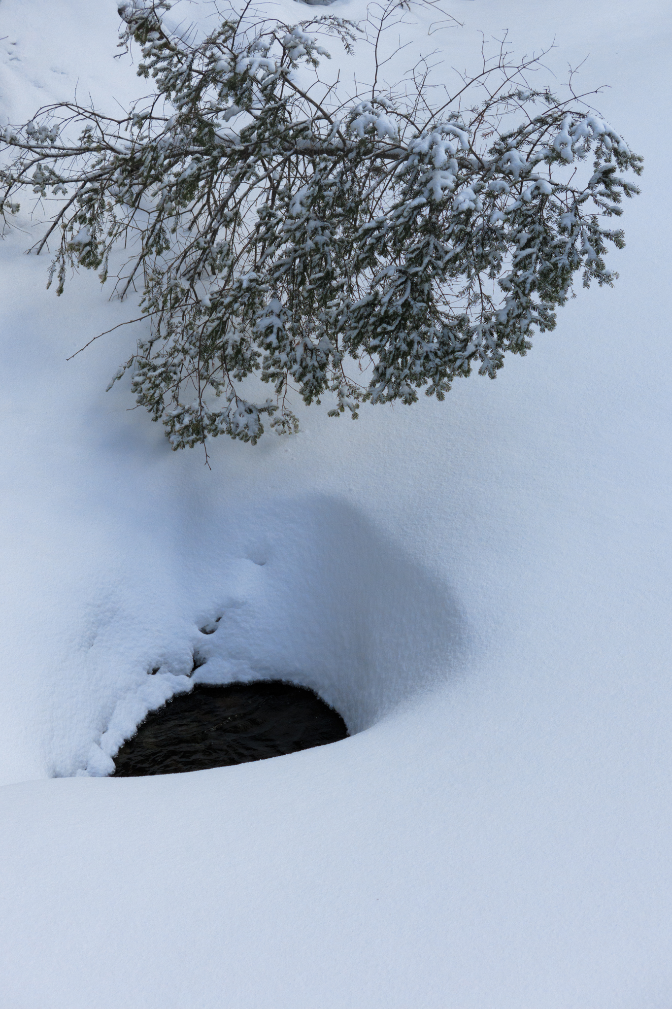 Les lecteurs assidus de mon blogue savent que devant de grands paysages, je suggère de faire une photo de l’ensemble puis par la suite, identifier un sujet plus restreint pour faire une 2e photo. Dans mon site Web sur la plateforme photo Smugmug, j’ai une galerie photo intitulée «Paysages intimes». J’aime capter des sujets plus intimes, moins à l’enseigne des grands espaces spectaculaires. Cette combinaison neige, eau et branche de conifères enneigée a retenu mon attention. J’ai donc fait un cadrage serré avec une perspective en plongée, du haut du petit pont au-dessus de ce ruisseau encore gelé et enneigé. Toutefois en l’absence de lumière, le tout est à plat, sans relief. Vous pouvez cliquer sur la photo pour voir celle-ci en plus grand format et noter les détails.