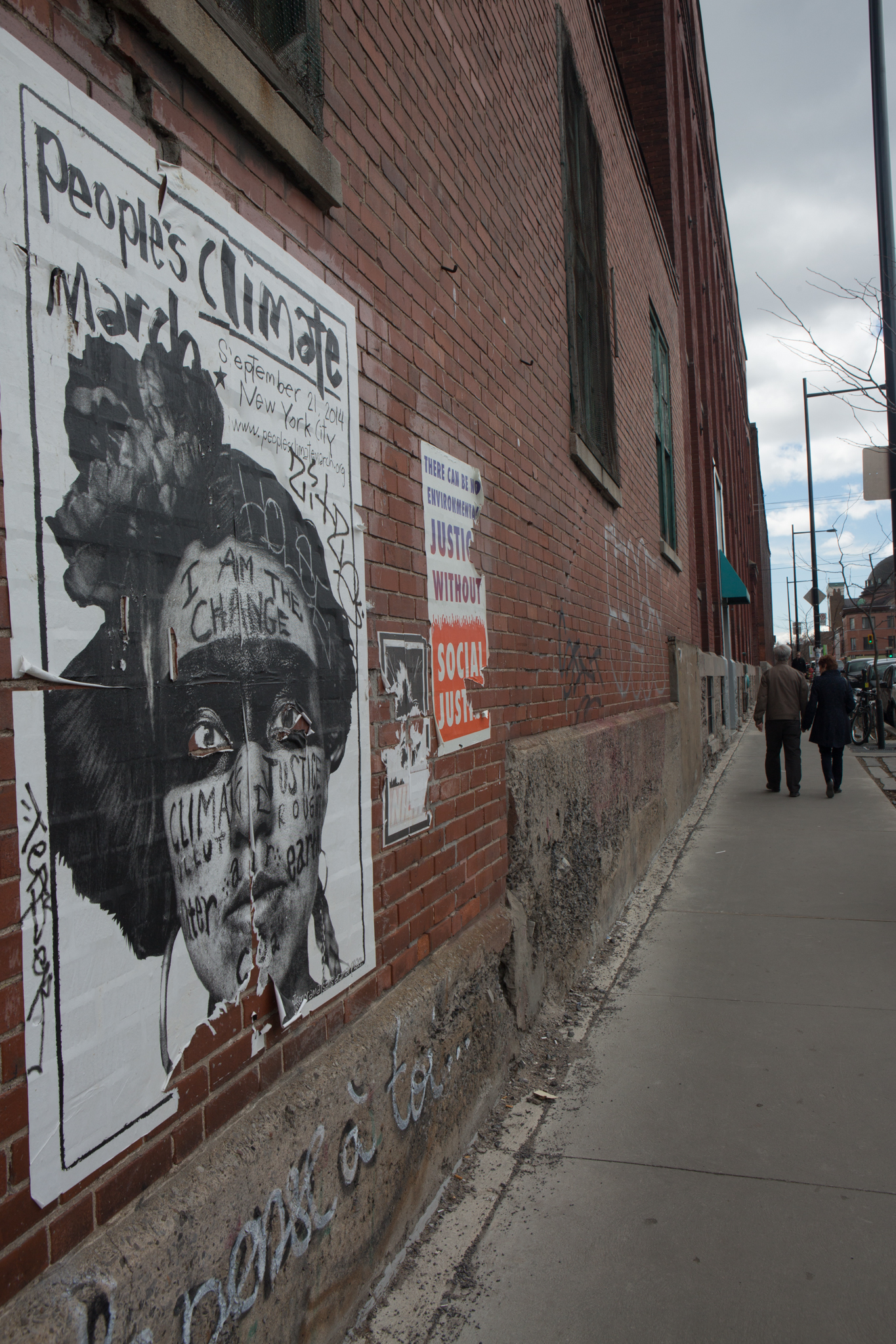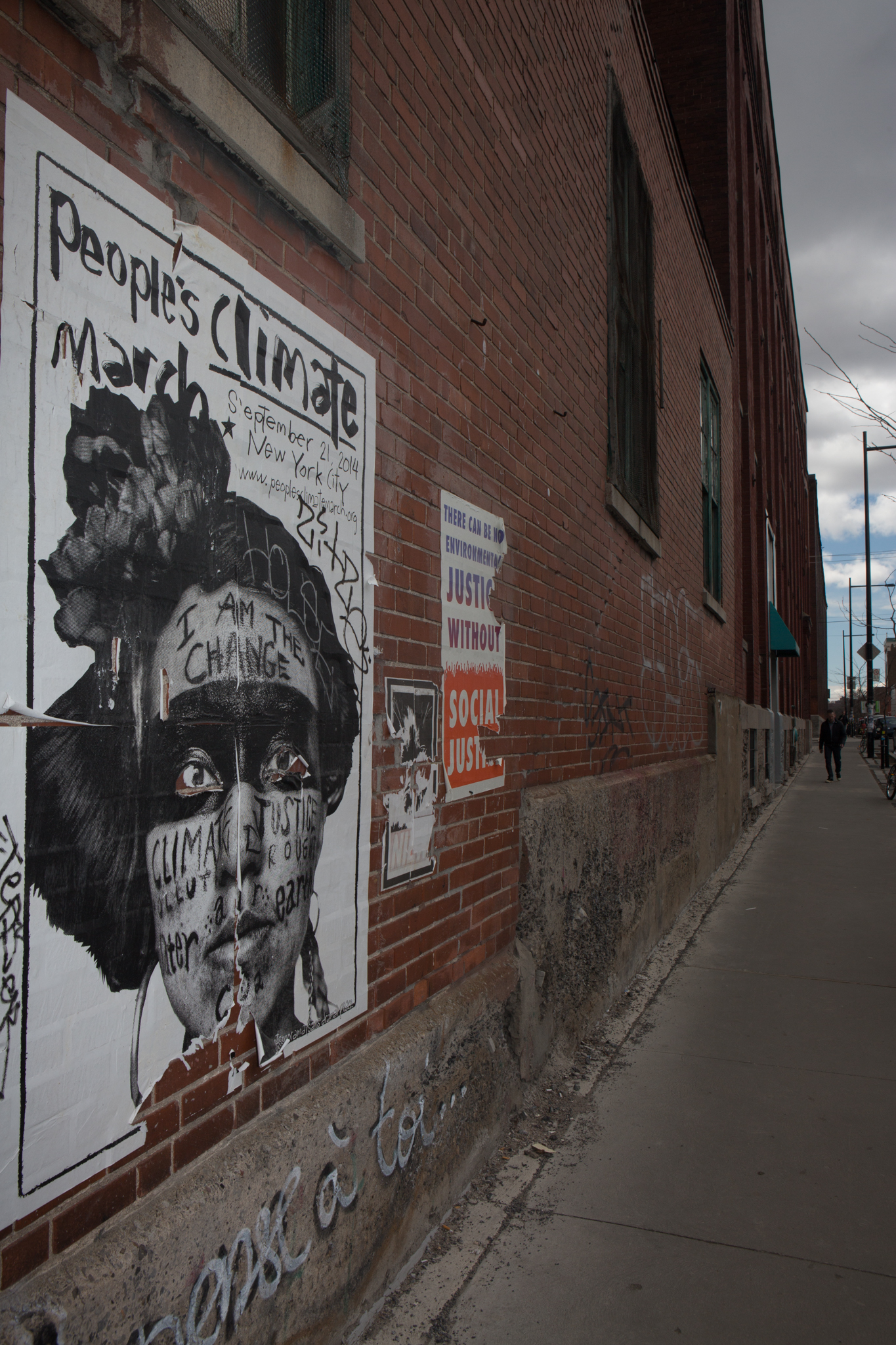 Pour ma photo finale, j’y suis allé avec ma recette habituelle.  Puisque j’aime les photos «dramatiques», j’ai sous-exposé ma scène non pas d’un cran (-1) mais de deux (-2).  28MM, F13, 1/200s.  Cette dernière prend des allures de fin de soirée, de tombée du jour alors que nous sommes vers 13 h.  Puisque le sujet principal de ma photo est cette affiche, j’ai alors allumé mon flash.  J’ai favorisé le mode TTL pour ce dernier.  Je me suis assuré de diriger le faisceau lumineux uniquement vers l’affiche. Il en résulte en une interprétation et une mise en scène photo de cette scène.  Tout l’accent est mis sur l’affiche avec les yeux du personnage qui illuminent et percent la nuit. En comparaison, tout est plus banal et sans trop de relief dans la photo originale plus haut.  Le flash vient de prendre son rôle comme outil créatif, agissant comme un projecteur sur une scène qui isole un acteur.