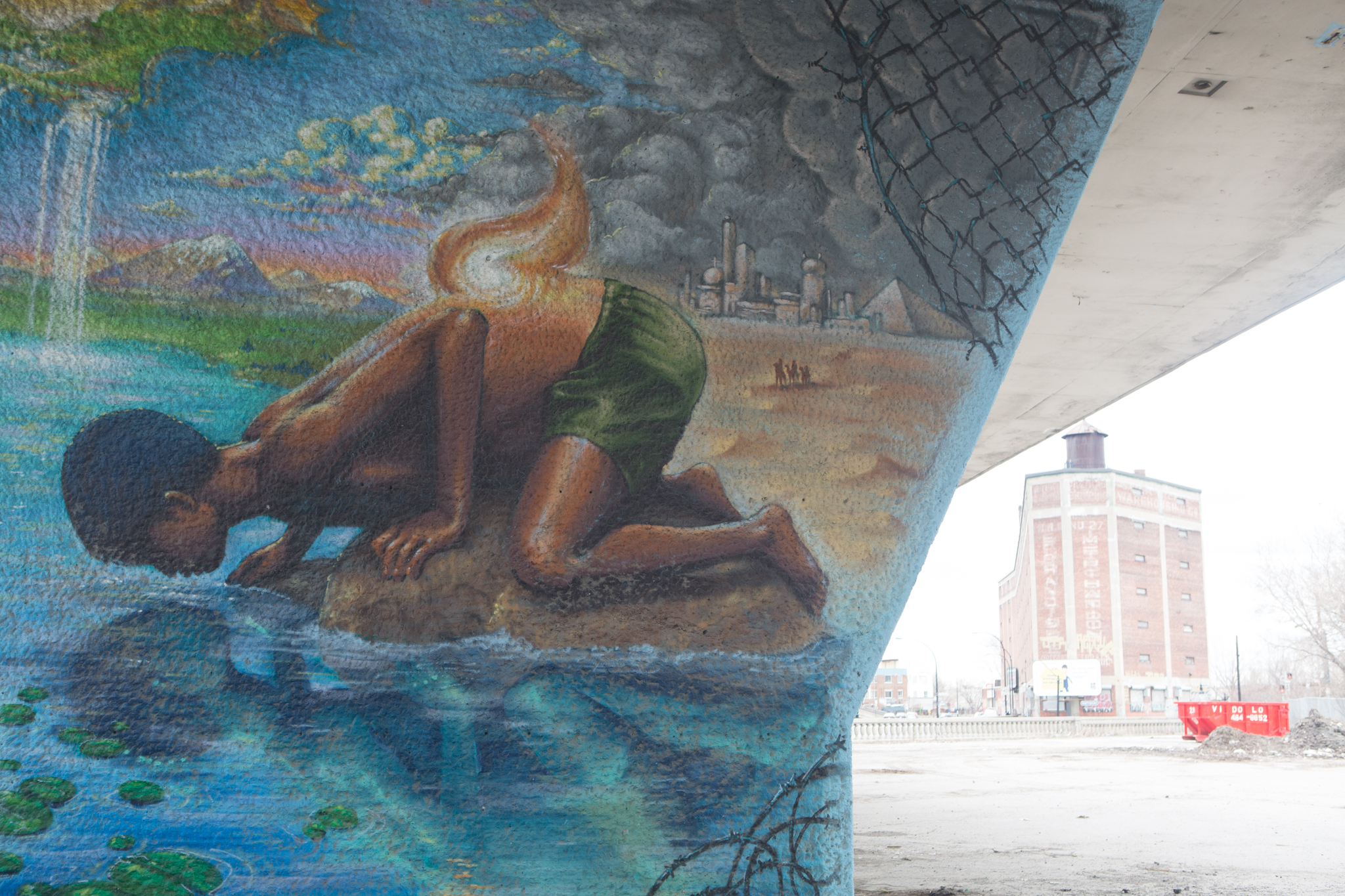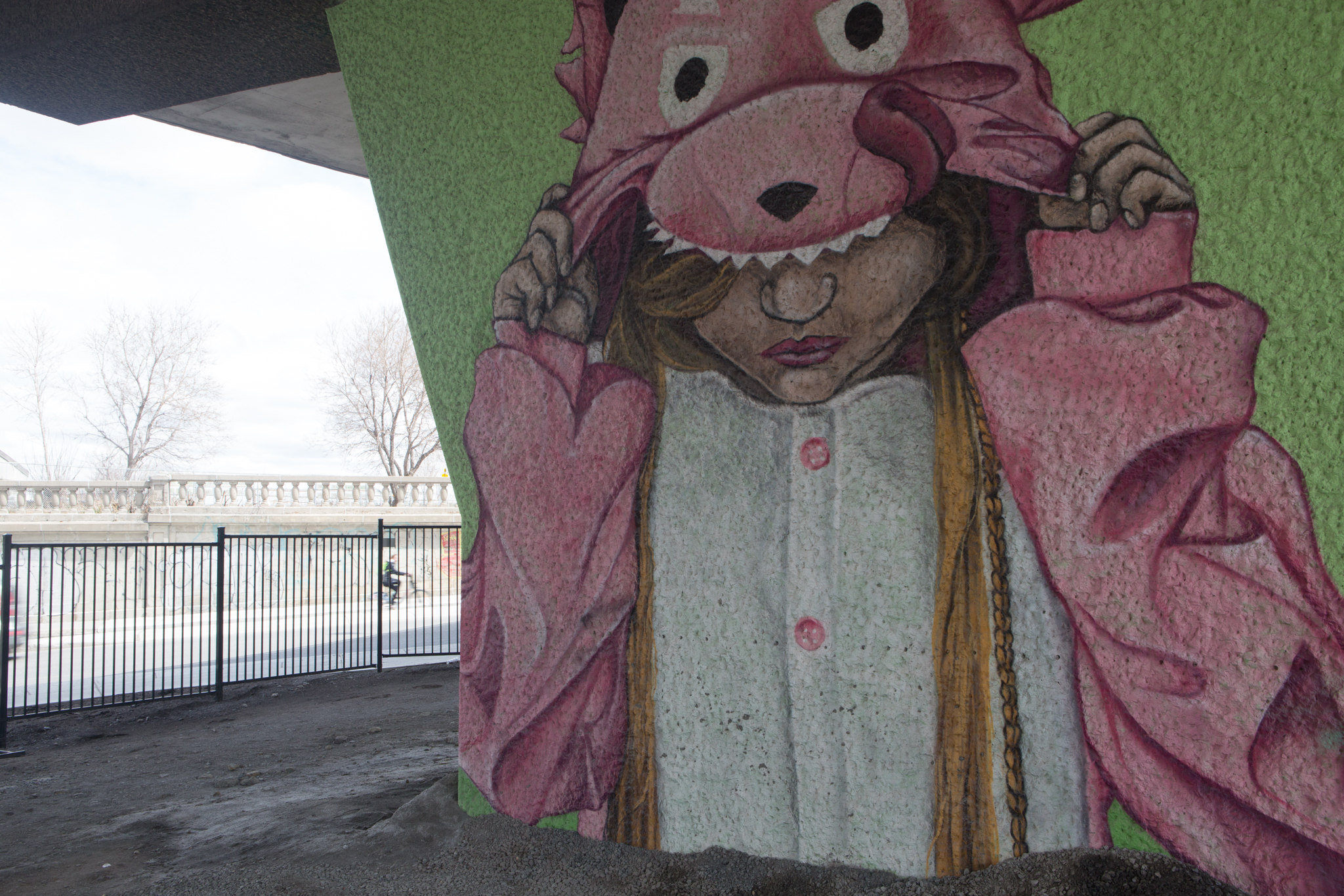 Je suis revenu à la technique dont je vous ai entretenu précédemment.  Sans chercher à «créer la nuit», j’ai bracketé pour sous-exposer volontairement la scène.  Encore ici, mon curseur pour le niveau d’exposition a été déplacé à -2.  J’ai donc retrouvé l’exposition juste pour l’extérieur.  J’ai ensuite allumé mon flash et je suis assuré de diriger mon faisceau vers la murale.  ISO: 400, F13, 1/200s avec flash.  J’étais en mode TTL encore une fois, quoique si l’intensité avait été trop importante, j’aurai eu recours au mode manuel du flash pour atténuer cette intensité.  Encore une fois, l’utilisation du flash nous permet à créer une mise en scène des éléments dans notre photo et surtout, nous est fort utile pour nous sortir d’une situation complexe.