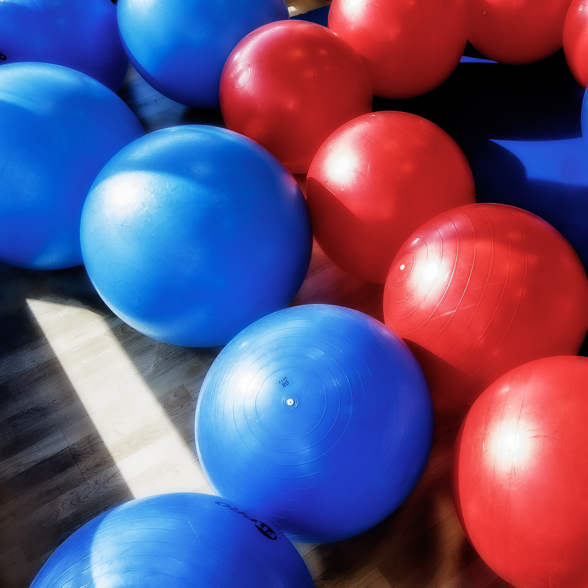 Une planche contact, c’est un peu (beaucoup) cela. C’est un récit où on part avec une vision qui se transforme. La partie de plaisir a débuté au détour d’une salle d’exercice où j’ai vu tous ces ballons colorés. En prime, la lumière du matin levant était belle. La répétition d’un objet n’est-elle pas en soi une belle opportunité photo? Je me suis au boulot en me disant qu’il y avait de la matière pour mon blogue photo. J’ai donc pris une 1ère photo rapidement. Elle présente plusieurs défauts. Le cadrage est correct, sans plus, mais il donne place à trop d’éléments distrayants: l’appareil d’exercice au fond de même que le ventilateur. L’ensemble manque également de dynamisme.