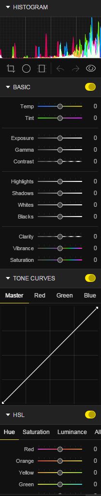 Premier constat au démarrage, l’interface s’apparente passablement à l’éditeur de Lightroom, particulièrement avec le menu de droite. On y retrouve par exemple les outils habituels pour le recadrage, le filtre radial de même que le filtre gradué. Ne manque que l’outil tampon (correction des défauts), correction des yeux rouge de même que le pinceau. Probablement qu’ils feront leur apparition avec la version 3 de Polarr qui se profile à l’horizon.