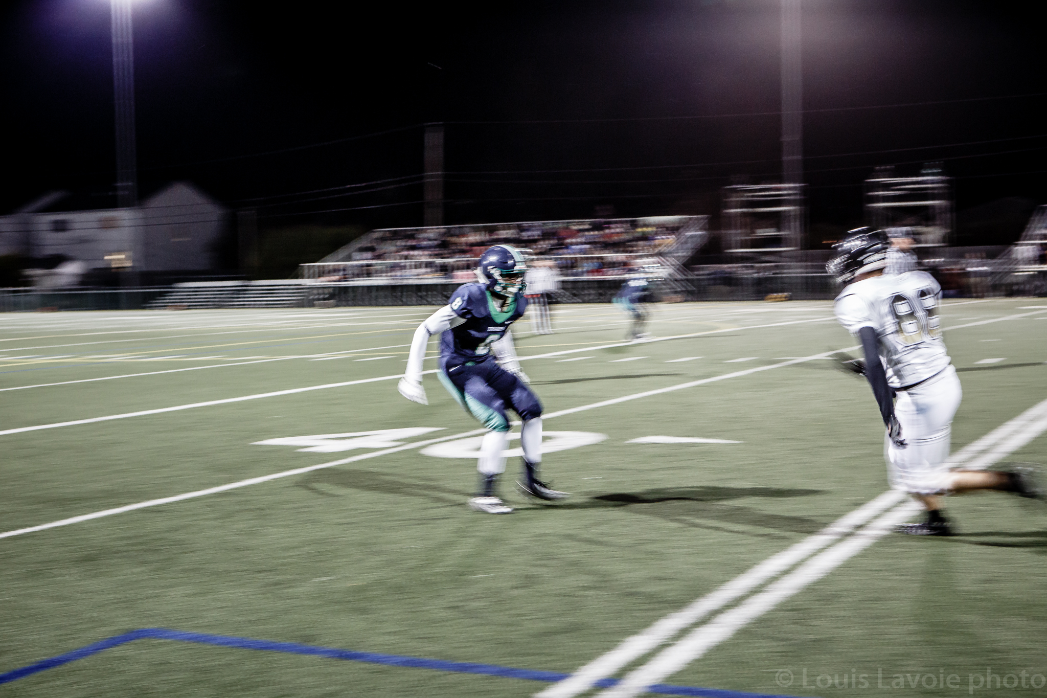 Lorsqu’on fait du sport comme dans le cas de la photo ci-dessus, on doit souvent cadrer plus large, surtout lorsque le mouvement des joueurs (athlètes) est imprévisible. Ça d’ailleurs été le choix que j’ai fait lors de ce match de football (américain) d’autant plus que je me suis appliqué à utiliser le filé dynamique (filé d’action) pour obtenir un effet particulier. Alors que la majorité des photographes cherchent à «figer» l’action, dans mon cas je cherchais plutôt à ce qu’un joueur soit «net» dans un tourbillon d’action. Je devais donc déplacer mon boîtier et suivre le mouvement du joueur sélectionné. L’effet recherché a été obtenu dans cette photo ci-dessus mais le sujet a moins d’impact en raison d’éléments superflus. Il y a trop d’espace à la gauche de mon joueur ce qui inclus également les maisons tout près des estrades dans l’arrière-plan tout comme trop de ciel noir. Que faire? Vive le recadrage.