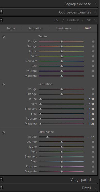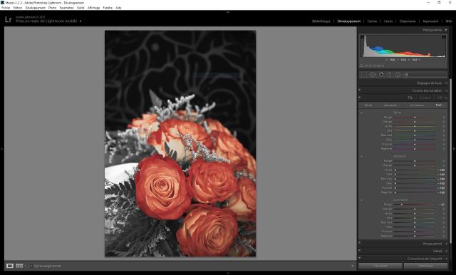 Bien connu, Lightroom permet facilement d’obtenir l’effet désiré, soit une colorisation sélective et ce grâce au panneau de contrôle TSL portant sur la teinte, la saturation et la luminance. Dans ce cas-ci, nous nous inspirerons de notre traitement à la Sin City pour retenir surtout des coloris rougeâtre et orangé dans nos fleurs. En utilisant les boutons de contrôle pour la saturation, voilà que nous sommes capables de basculer toutes les autres couleurs en noir et blanc pour ne retenir que le rouge et l’orange. En utilisant la luminance, on peut accentuer ou diminuer la tonalité de rouge ou l’orange sans nécessairement manipuler la saturation. En procédant par cette méthode, on parvient à conserver les coloris souhaités partout dans notre photo tout en créant rapidement un environnement noir et blanc, sans avoir recours à un pinceau de retouche et des manipulations délicates pour créer un masque.