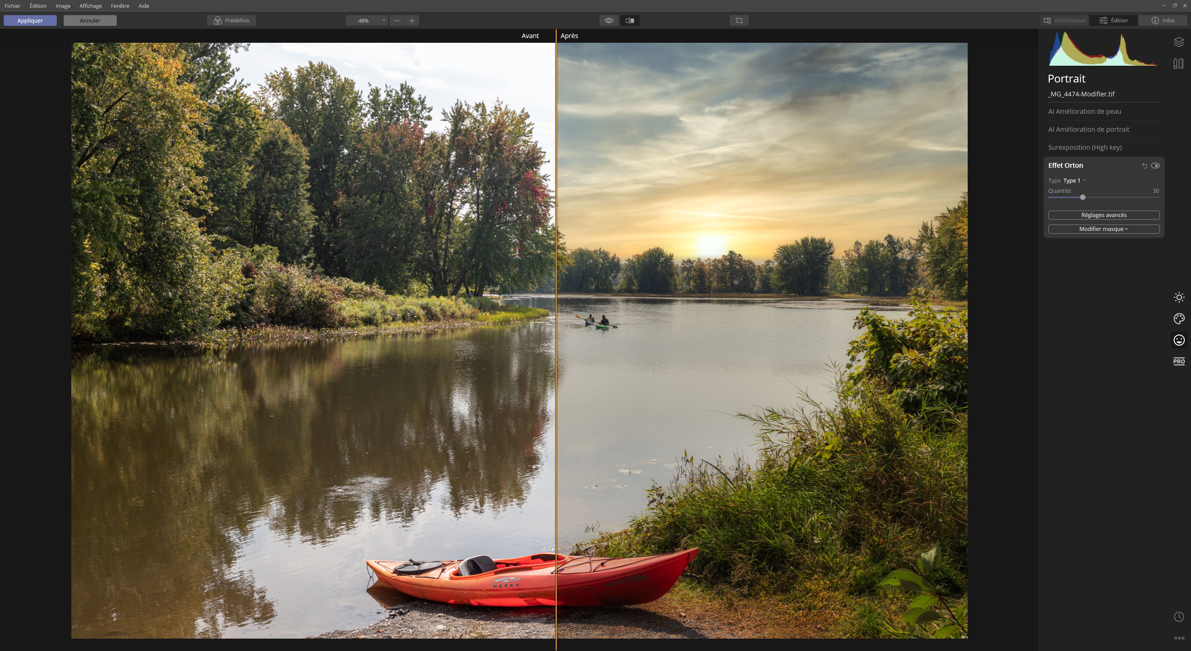 Belle démonstration de ce que peut faire Luminar 4 en photo de paysage, merci Louis. Par contre, selon moi, l’ombre du kayak ne va pas avec la direction du soleil…